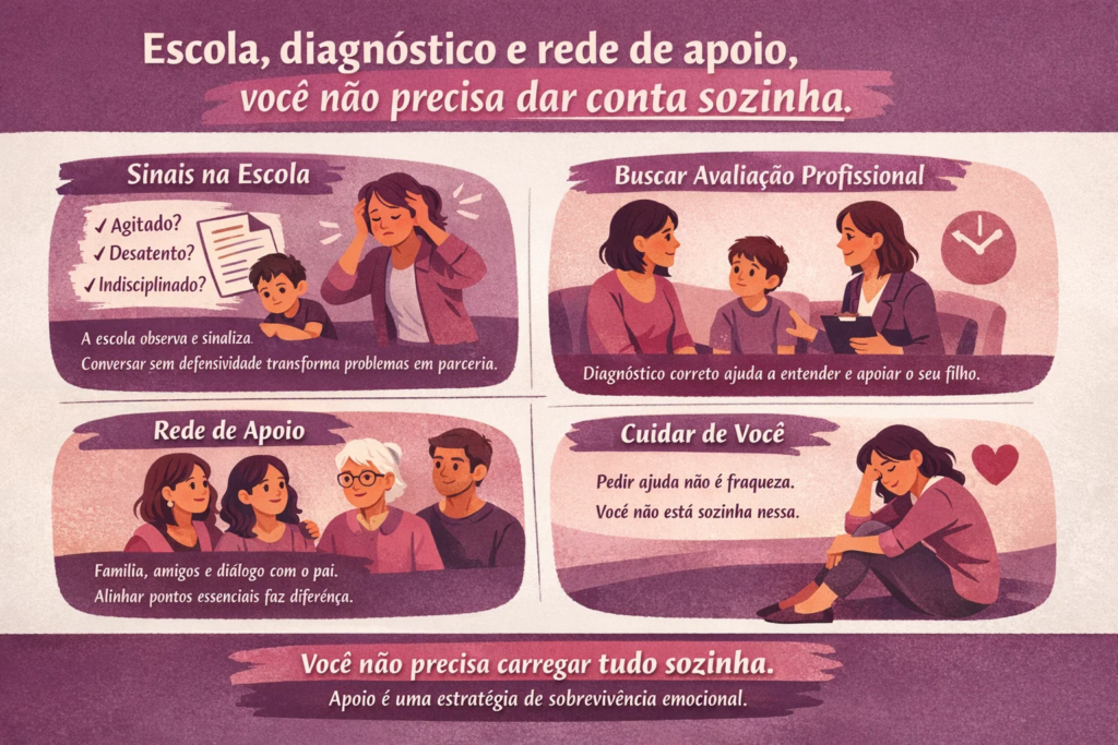Você não precisa carregar tudo sozinha. Crianças com TDAH e hiperatividade se desenvolvem melhor quando os adultos ao redor atuam como uma equipe, ainda que imperfeita. Apoio não é sinal de fraqueza, é estratégia de sobrevivência emocional.
