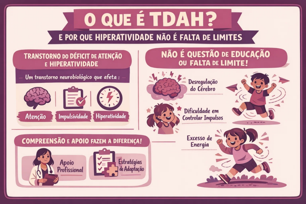 O Transtorno do Déficit de Atenção com Hiperatividade é uma condição do neurodesenvolvimento. Isso significa que ele está relacionado à forma como o cérebro da criança regula atenção, impulsos e níveis de atividade. Não é birra. Não é má educação. Não é resultado de criação inadequada.