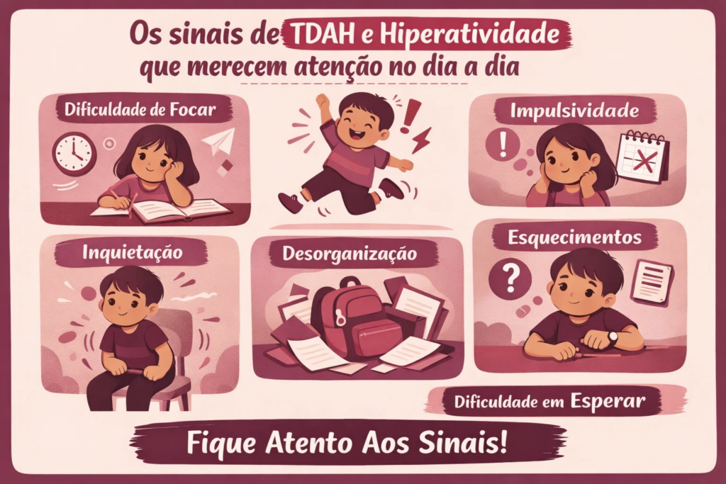 Os sinais costumam aparecer de forma gradual e persistente. Não é um dia ruim, não é uma semana difícil. É um padrão que se repete em casa, na escola e em diferentes ambientes. Dificuldade para manter atenção, esquecer tarefas simples, perder objetos com frequência, começar atividades e não concluir, agir por impulso e ter explosões emocionais são alguns dos comportamentos mais comuns.