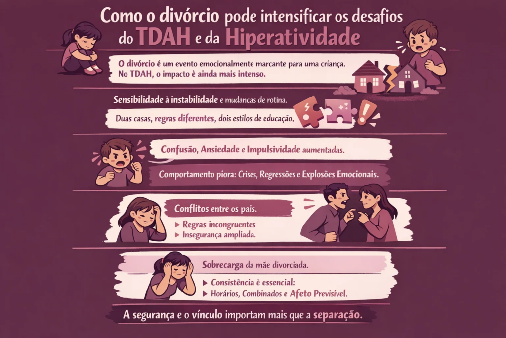O divórcio, por si só, já é um evento emocionalmente marcante para uma criança. Quando existe TDAH e hiperatividade, esse impacto tende a ser ainda mais intenso. Não porque a separação cause o transtorno, mas porque a criança com TDAH é mais sensível a mudanças, rupturas de rotina e instabilidade emocional.